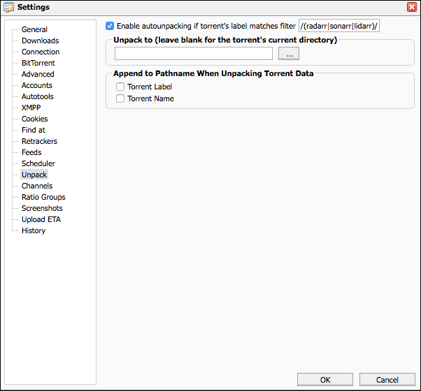 3. Check "Enable autounpacking if torrents label matches filter" and add the following: